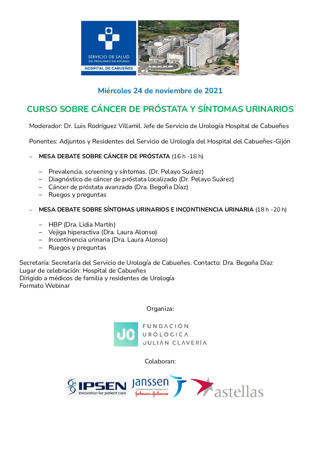 La Fundación Urológica Julian Clavería organiza el primer curso sobre “CÁNCER DE PRÓSTATA Y SÍNTOMAS URINARIOS” dirigido a médicos de Atención Primaria y residentes de Urología en Formato Webinar. El curso se desarrollará el próximo 24 de noviembre de 2021 a partir de las 16:00 horas.